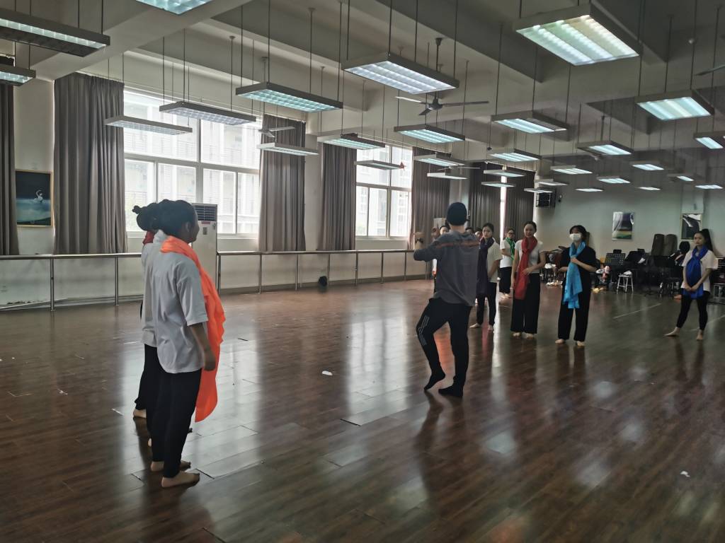 在排練中,為了讓學(xué)生能更好的理解與完成節(jié)目,排練老師積極配合導(dǎo)演,不斷的向?qū)W生講解節(jié)目所要表現(xiàn)的情感、寓意,啟發(fā)學(xué)生對(duì)每一個(gè)場(chǎng)景的刻畫、角色的塑造與動(dòng)作的理解。排練中,老師親自示范,師生們一起在排練場(chǎng)上揮灑汗水。學(xué)生被排練老師的精神所鼓舞,排練場(chǎng)上,氣氛高昂。