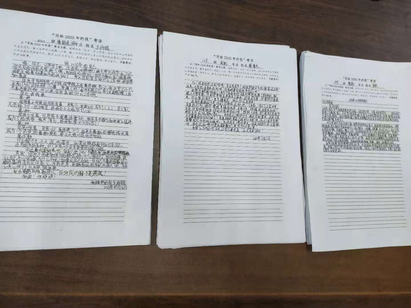 各班級班主任引導(dǎo)學(xué)生梳理總結(jié)“四史”學(xué)習(xí)感悟,結(jié)合所學(xué)專業(yè),培養(yǎng)把小我融入大我、融入中華民族偉大復(fù)興中國夢的職業(yè)理想。組織學(xué)生以書信形式,寄語2035年的自己,展望未來,寄托理想,努力奮斗。