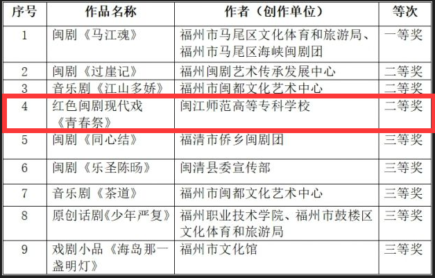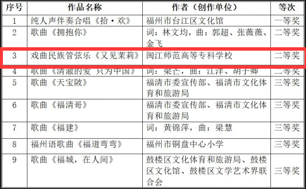 近日,福州市第五屆茉莉花文藝獎(jiǎng)評(píng)審工作結(jié)束,經(jīng)各藝術(shù)門(mén)類(lèi)專(zhuān)家進(jìn)行認(rèn)真嚴(yán)肅、集中規(guī)范、公平公正的評(píng)審,共評(píng)出擬獲獎(jiǎng)作品90件。其中,我校戲曲民族管弦樂(lè)《又見(jiàn)茉莉》榮獲音樂(lè)二等獎(jiǎng),紅色閩劇現(xiàn)代戲《青春祭》榮獲戲劇二等獎(jiǎng)。