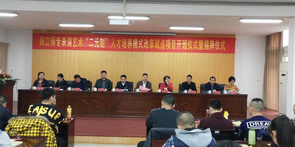2017年11月20日,閩江師范高等??茖W(xué)校首屆表演藝術(shù)(閩劇表演)“二元制”人才培養(yǎng)模式改革試點項目開班儀式暨揭牌儀式在我校區(qū)辦公樓五樓會議室隆重舉行。出席開班儀式的領(lǐng)導(dǎo)及嘉賓有我校黨委書記陳榮生、副校長張昌勛,福州市文化廣電新聞出版局調(diào)研員盧玲,福州閩劇藝術(shù)傳承發(fā)展中心主任楊東、副主任林穎以及閩劇表演藝術(shù)家、原福州市藝術(shù)學(xué)校校長陳乃春、原閩劇院院長林培新等。此外,還有表演藝術(shù)大專班2017級21名新學(xué)員、藝術(shù)系及我校區(qū)各位領(lǐng)導(dǎo)、閩劇科師生一同參加開班儀式。