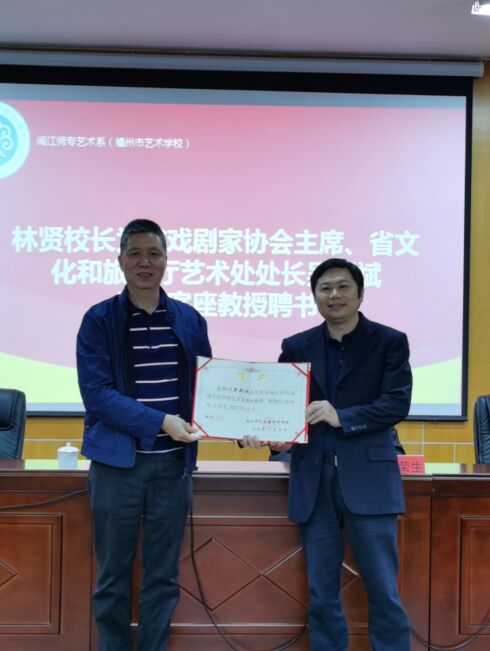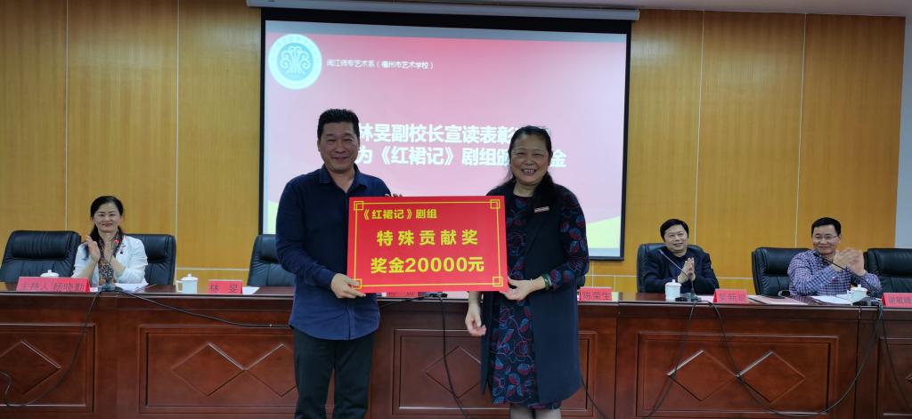 會(huì)上,閩劇《紅裙記》主創(chuàng)人員陳乃春、林萍、林夢(mèng)萍分別介紹了劇目編創(chuàng)、排練、演出的有關(guān)情況及心得體會(huì)。接著,林旻副校長(zhǎng)宣讀表彰決定,并為《紅裙記》劇組頒發(fā)特別貢獻(xiàn)獎(jiǎng),獎(jiǎng)金20000元。林賢校長(zhǎng)為省戲劇家協(xié)會(huì)主席、省文化和旅游廳藝術(shù)處吳新斌處長(zhǎng)頒發(fā)了客座教授聘書(shū)。