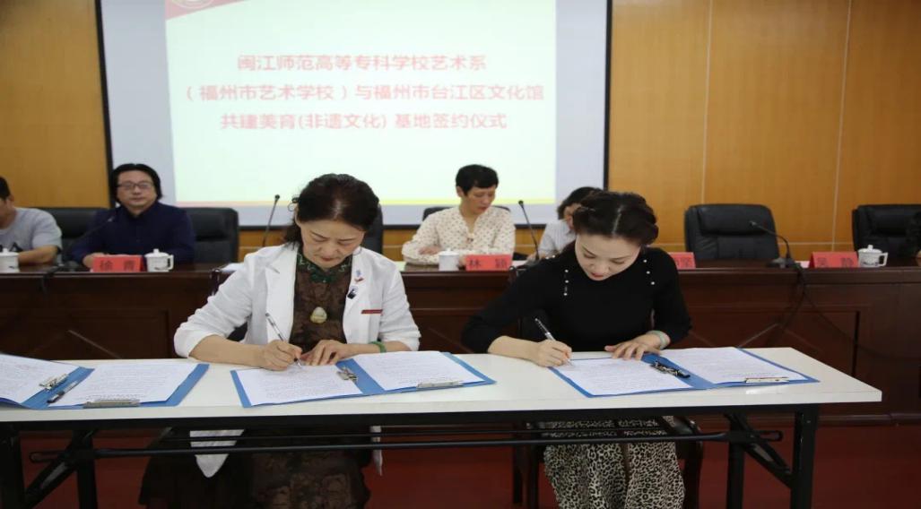 藝術系主任(福州市藝術學校校長)楊曉勤、臺江區(qū)文化館館長吳靜簽訂合作協議書