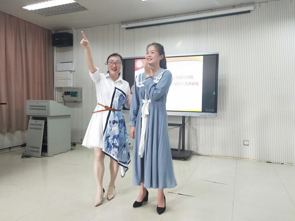 劉淘副院長(zhǎng)通過(guò)意大利詠嘆調(diào)、中國(guó)民歌等不同風(fēng)格的歌曲,從氣息、聲音位置、咬字方式及情感處理等方面為大家講解并演示了不同風(fēng)格的歌曲要如何運(yùn)用,使學(xué)生們受益匪淺。在講座的過(guò)程中,劉淘副院長(zhǎng)不斷的教導(dǎo)大家如何在教學(xué)的過(guò)程中輔導(dǎo)學(xué)生的演唱,包括歌曲背景的學(xué)習(xí)、氣息的運(yùn)用及聲音的變化等。
