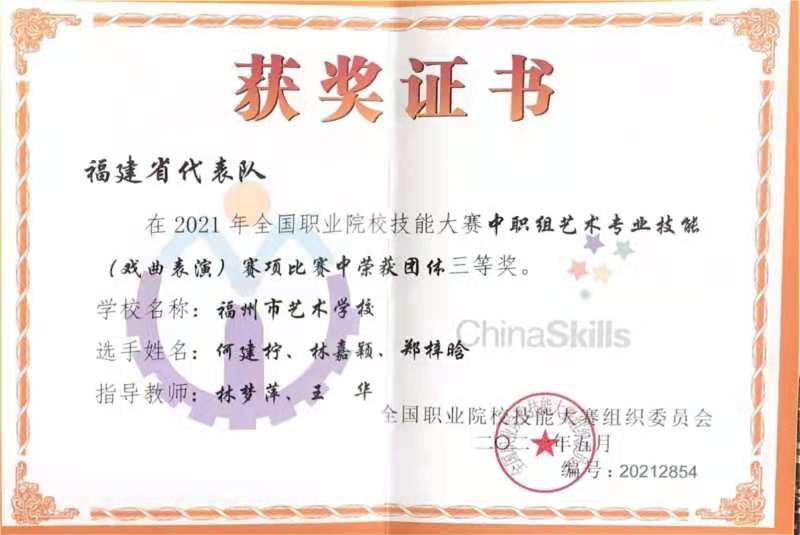 經(jīng)過為期兩個多月的專項訓練,我校何建檸、林嘉穎和鄭梓晗3名選手通過兩輪劇目和唱、念、做、打環(huán)節(jié)比賽,取得了國賽團體三等獎。作為地方劇種,在與京昆劇種合并比賽、競爭激烈、獎項少的情況下獲此殊榮,實屬不易。本次比賽得到了學校領導與系部高度重視,藝術系黨總支江柳青書記、藝術系副主任(主持工作)、福州市藝術學校校長徐青為此多次召開賽項籌備會議,進行賽項部署,竭力為參賽選手創(chuàng)造最優(yōu)質(zhì)的備賽條件。師生與時間賽跑,為學校爭得榮譽,全面展示學校教學成果。