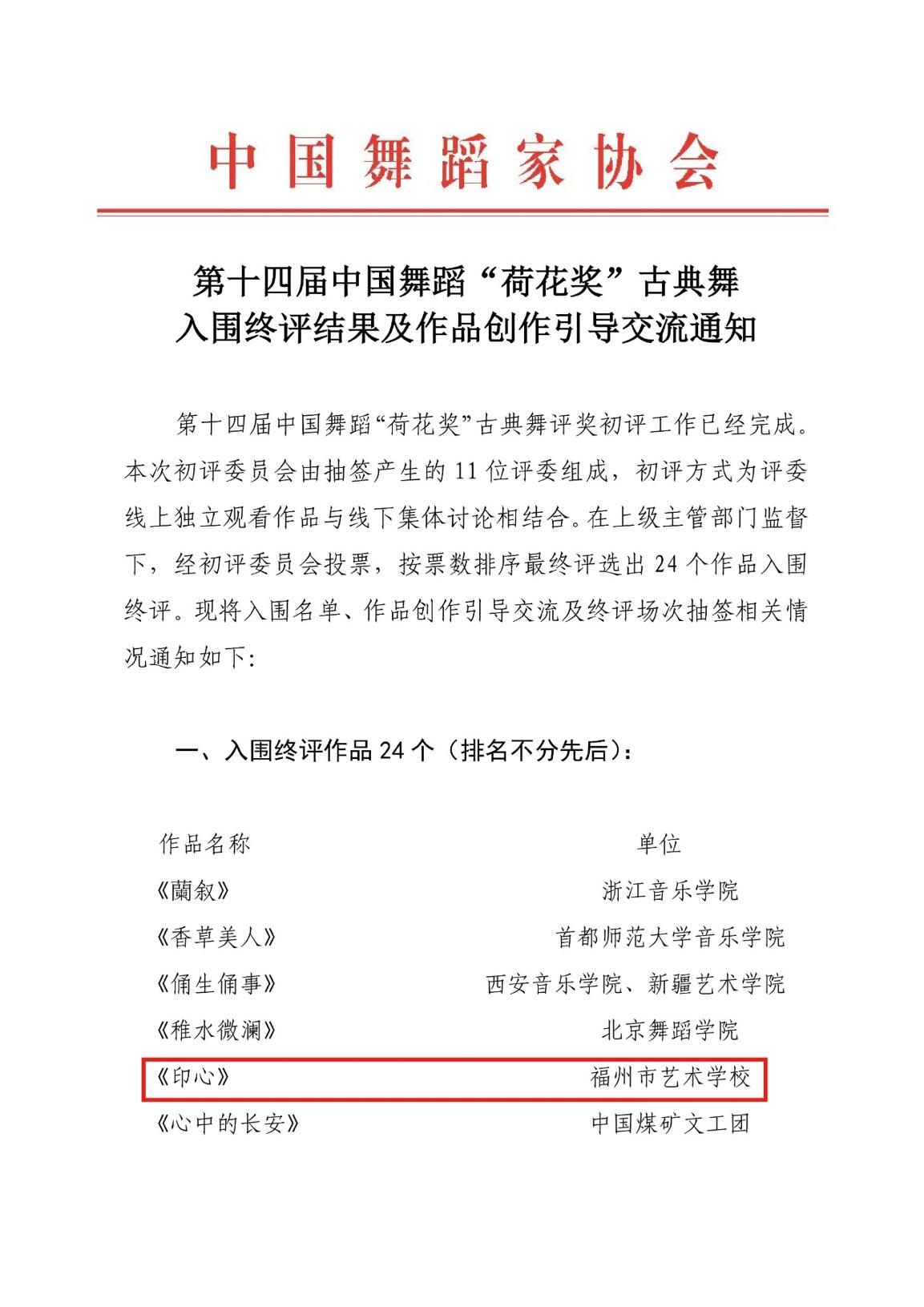 由中國文學(xué)藝術(shù)界聯(lián)合會、中共浙江省委宣傳部、中國舞蹈家協(xié)會、浙江省文學(xué)藝術(shù)界聯(lián)合會主辦的第十四屆中國舞蹈“荷花獎”古典舞評獎將于2024年11月中旬在杭州舉行。日前,第十四屆中國舞蹈“荷花獎”古典舞評獎入圍終評結(jié)果公布,全國共有24部作品入圍古典舞終評,由福建省舞蹈家協(xié)會選送、福州市藝術(shù)學(xué)校排演的舞蹈《印心》成功入圍。