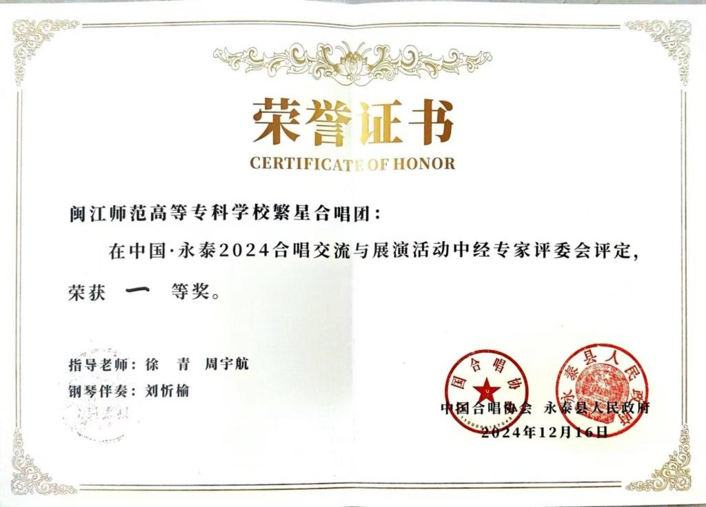 2024年12月14日由中國(guó)合唱協(xié)會(huì)與永泰縣人民政府聯(lián)合主辦的“放歌綠水青山 擁抱健康中國(guó)”中國(guó)·永泰2024合唱交流比賽與展演暨“菜籃公”合唱藝術(shù)游學(xué)博覽在福州市永泰縣永泰大劇院開賽。由我院50名合唱團(tuán)員組成的繁星合唱團(tuán)于當(dāng)晚22點(diǎn)參加了本次成人混聲組比賽,在激烈的角逐中,我院繁星合唱團(tuán)表現(xiàn)優(yōu)異,榮獲本次比賽成人混聲組一等獎(jiǎng)。